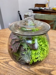 A couple of days ago while hanging out on the couch, I looked at the plants sitting around the room, snuck out to a crafts store for a large jar, and made a terrarium. Because what are we all, now, if not organisms living in closed worlds? Rhetorical question, but still.