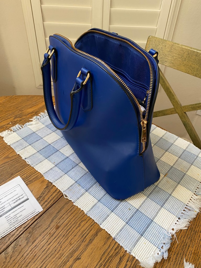 However, here is the purse I carry day-to-day, usually filled to capacity with lunch, sodas, and journal in addition to the usual occupants: